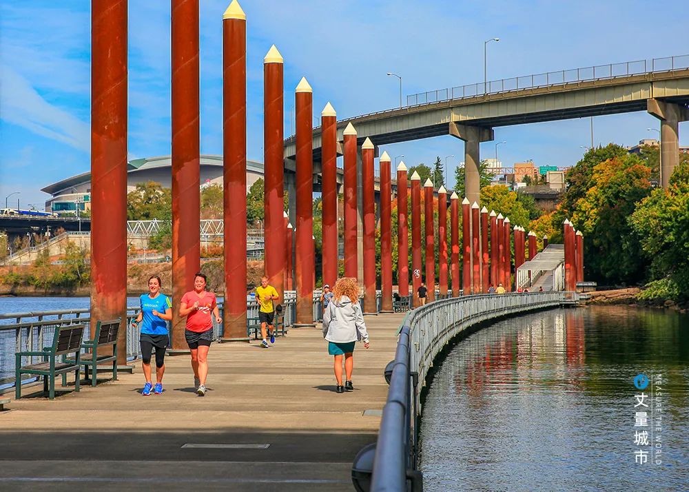 其中約有1.6公里延伸至河邊,包括位于305米水面上隨著河面的漲落而變化的人行道,與對岸的湯姆·麥考濱水公園形成良性的互動,共同成為波特蘭最為優質的公共空間。