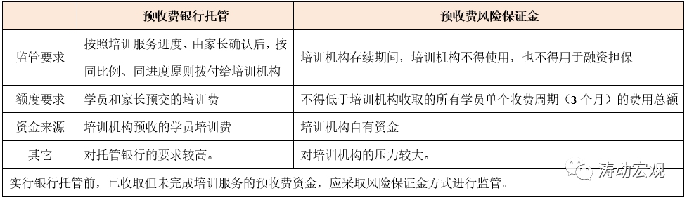 為避免出現“退費難、卷錢跑路”等情況,2號文提出通過銀行托管和風險保證金兩種方式實行預收費監管。這兩種方式各地可以根據實際情況自主選擇。