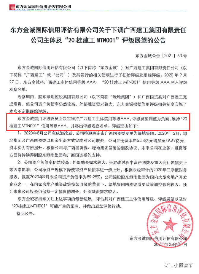3月31日,東方金誠公告稱,決定維持廣西建工集團有限責任公司(以下簡稱“廣西建工”)主體和“20掛建工MTN01”信用等級AAA,評級展望調整為負面,并移出評級觀察名單。