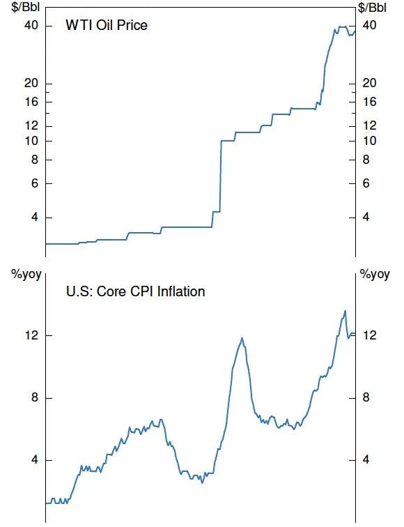 一般來說,“突變”狀態(tài)多來自于“供給端”和“外生沖擊”。比如1973年中東石油危機期間,國際油價從4美元/桶一年之內(nèi)上漲至10美元/桶,之后數(shù)年上漲至40美元/桶,對推升核心通脹等產(chǎn)生了巨大的影響(圖3)。其他的外部沖擊可能包括: