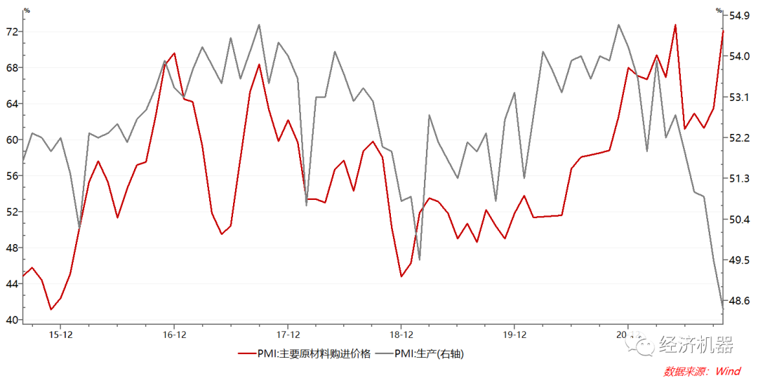 上周,官方PMI公布,制造業(yè)PMI為49.2,連續(xù)2個月低于50分界線以下,連續(xù)7個月出現(xiàn)放緩。分項中,生產(chǎn)、訂單等“量”相關的指標繼續(xù)下滑,而原材料價格等“價”相關的指標大幅攀升,過去一段時間以來兩者持續(xù)分化的趨勢達到了一個新的水平。