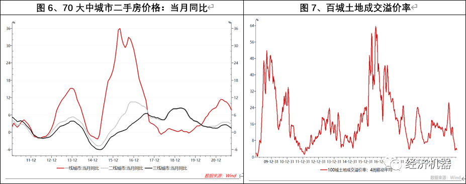 2)全國各線城市房價出現(xiàn)同步回落,土地市場遇冷,種種跡象表明,房地產(chǎn)市場或?qū)⑦M入一個下行周期。2015年-2016年,房地產(chǎn)市場處于同步上漲階段,一線漲幅領先于二線,二線領先于三四線。2017-2020年間,各線城市之間出現(xiàn)分化。2021年下半年以來,多因素沖擊下,一二三四線房價同步出現(xiàn)回落;同時土地市場急速轉(zhuǎn)涼,土地溢價率接近于0,各地流拍現(xiàn)象不斷上升,種種跡象表明,房地產(chǎn)市場在快速轉(zhuǎn)涼,有可能進入一個較長階段的同步下行周期。