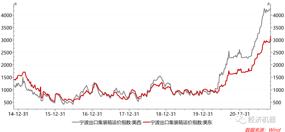 - 疫情沖擊下,供應鏈危機比預期更嚴重。疫情沖擊下,全球出現(xiàn)了嚴重的供應鏈危機。年初,市場普遍認為,隨著疫苗接種完成和經(jīng)濟活動恢復,供應鏈斷裂的情況會出現(xiàn)緩解。但下半年以來,供應鏈危機非但沒有緩解,反而呈現(xiàn)愈演愈烈走勢,歐美多個港口出現(xiàn)貨物積壓,缺少卡車司機將貨物運離。電力、原材料短缺是供應鏈危機的重要原因。盡管疫情整體上得到有效控制,但部分西方國家將“疫苗簽證”政治化,阻礙了國際間貨物通關和人員流動,惡化了供應鏈危機。寧波集裝箱出口運價指數(shù)國慶后再創(chuàng)新高,顯示近期供應鏈危機并未有效緩解。目前供應鏈危機已經(jīng)成為全球性問題,除非各國間協(xié)調(diào)應對,否則未來大概率會進一步惡化。