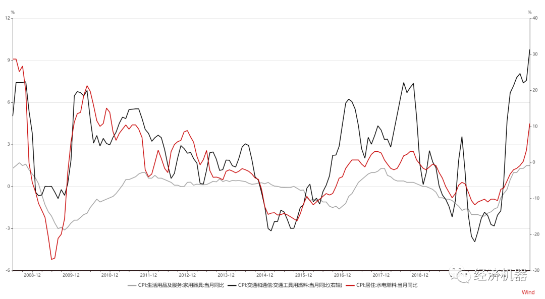非食品通脹方面,電價在工商企業(yè)上浮比例大幅提高,尤其是對高耗能企業(yè)用電完全放開,將會推升工商業(yè)成本。用電成本在工業(yè)中處于最基礎的地位,類似于糧食在農(nóng)業(yè)中的作用,用電成本上升,將會加速向終端消費傳導。目前水電燃料和家電類漲價跡象明顯。此外,由于國際原油價格上漲,最近交通燃料分項同比大幅上漲,幅度超過20%(圖17)。