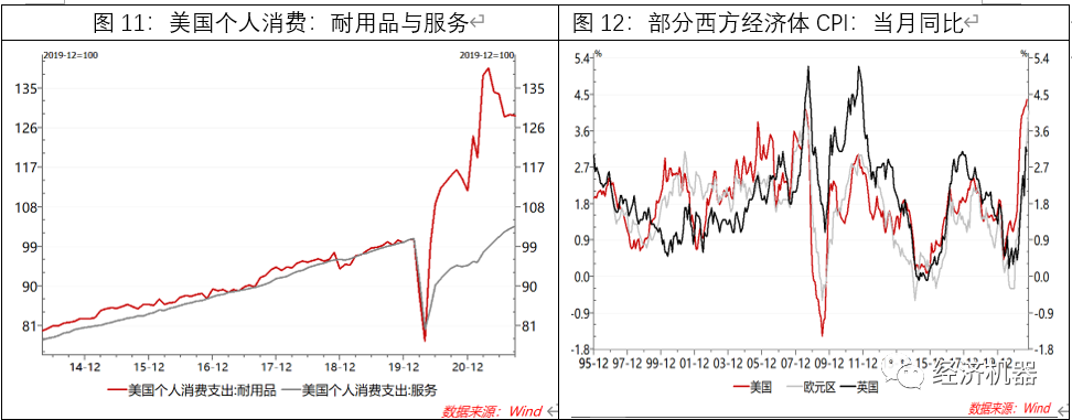 - 海外需求沖擊帶來的輸入性通脹。疫情期間,以美國為首的西方國家推出了大力度的財政刺激措施,包括向民眾派發(fā)現(xiàn)金,導致居民儲蓄率和購買力大幅提高。隨著疫苗接種,需求領先于供給而恢復,耐用消費品需求更是出現(xiàn)“井噴”,速度遠快于服務消費(圖11),加劇了其國內(nèi)的大通脹(圖12)。由于耐用品多屬于貿(mào)易品,通過國際貿(mào)易形式,向我國輸入了通脹壓力。