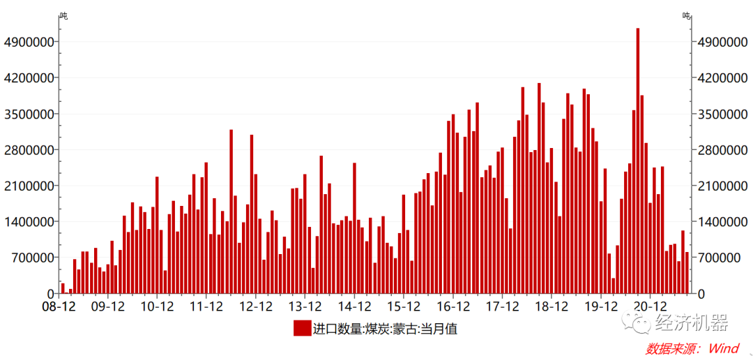 圖10:2021年蒙古煤炭進口:過于嚴厲的通關政策下持續(xù)下滑