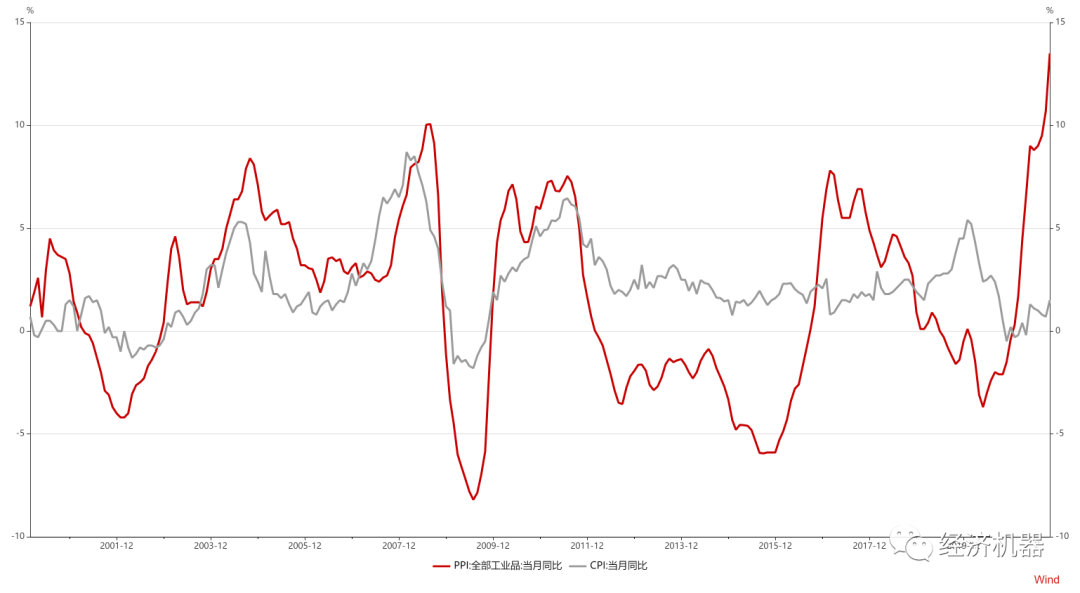 今日,10月通脹數(shù)據(jù)出爐,CPI、PPI均超預期上漲。其中,CPI受近期食品(豬肉、蔬菜等)價格上漲帶動,加速上行,同比上漲1.5%,預期1.3%,較前值提升0.9個百分點;PPI則受大宗商品漲價影響,同比繼續(xù)大幅上行至13.5%,預期12%,連續(xù)3月創(chuàng)有記錄以來歷史新高。