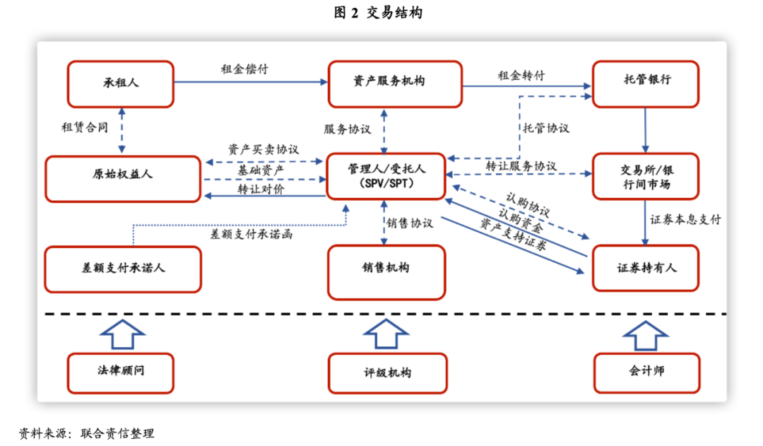 在常見的融資租賃資產支持證券的交易結構中,一般由管理人/受托人設立特殊目的載體(SPV/SPT),管理人/受托人收到募集資金后,用于向原始權益人購買租賃債權資產,再以租賃債權資產形成的本息收益按交易結構的約定向資產支持證券持有人還本付息。融資租賃債權資產支持證券一般交易結構如上圖所示。一般而言,原始權益人會繼續承擔資產服務機構的角色,對屬于SPV/SPT的基礎資產現金流回款進行歸集、轉付、催收以及違約基礎資產租賃物的處置。