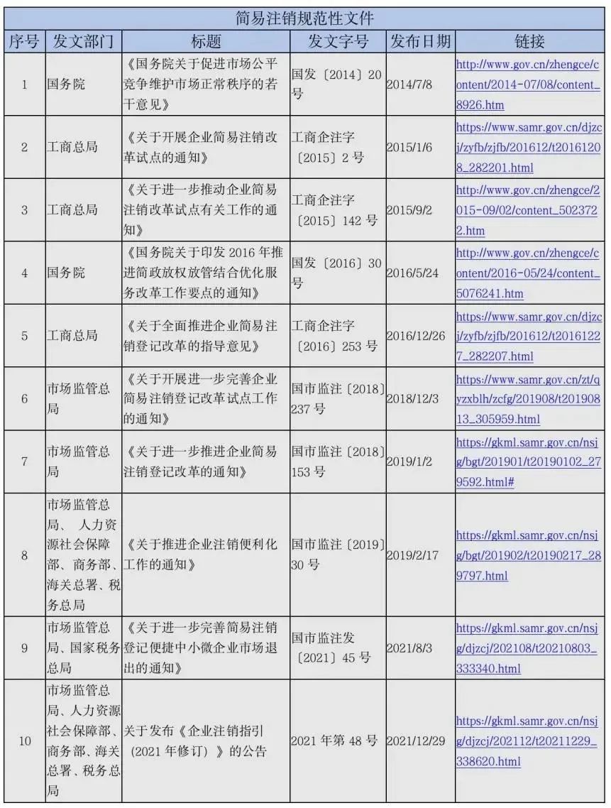 以此為背景,國家推出簡易注銷制度。伴隨著相關部門相繼出臺以下文件,簡易注銷制度不斷完善: