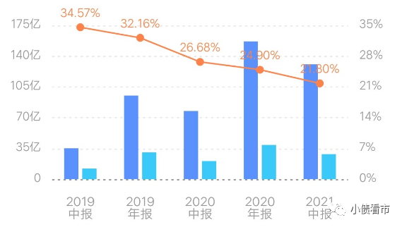 業績下降的同時,德信中國的盈利能力也在下滑,2021年上半年其毛利率為21.8%,同比下降4.88個百分點。