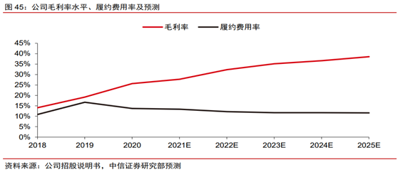 受公司平臺收入提高,以及對費用有效管控影響,公司經營毛利率和履約費用率情況不斷改善。數據顯示,公司經營毛利率從2018年的14.13%增長到當前的26.35%。據中信證券研究顯示,未來公司毛利率將持續走高,到2025年將達到35%以上。同時履約費用率也呈現不斷下降趨勢,預計未來將保持在10%附近。