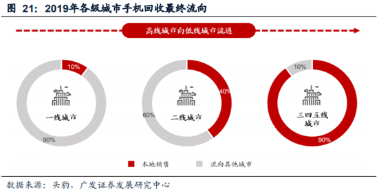 數據顯示,下沉市場消費需求依舊強勁。據頭豹研究院研究結果表明,二手手機交易整體呈現高線城市向低線城市流通態勢:一線城市回收的手機中,10%在本地銷售,90%流向其他城市;二線城市回收的手機中,40%在本地銷售,60%流向其他城市;三至五線城市回收的手機中,90%在本地銷售,10%流向其他城市。