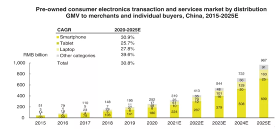 當前行業仍處于快速發展的初期階段。據灼識咨詢(CIC)的數據,2015年至2020年,中國二手3C行業的市場規模由510億元增至2252億元,年化復合增長率高達34.5%。到2025年行業將達9670億元規模。年復合增速仍在30%以上,以手機為例,當前二手手機回收率僅3.7%,可見未來成長空間仍然巨大。