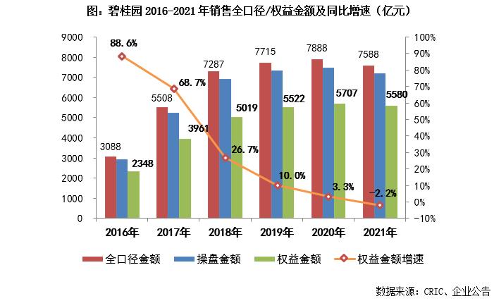 2021年行業下行調整、市場波動加劇,規模房企整體目前完成情況不及歷史同期,有逾8成企業未完成全年業績目標。碧桂園雖然業績規模也略有下降,但在全口徑、操盤、權益三大口徑的業績規模均保持在行業第一的位置。