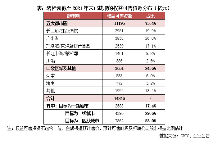 從土地儲備來看,截至2021年末碧桂園總土地儲備權益可售資源1.82萬億元,其中已獲取的權益可售資源1.48萬億元、潛在的權益可售資源0.34萬億元。碧桂園持續看好中國新型城鎮化發展,土地儲備布局兼具廣度和深度。在截至2021年末的權益可售貨值中,有75.4%位于五大城市群、98%位于常住人口50萬人以上的區域、93%位于人口流入區域。
