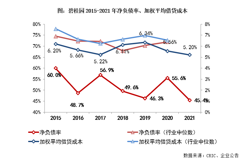 碧桂園堅持對回款目標強考核,2021年實現權益物業銷售現金回款5022億元,權益回款率已連續6年超過90%。截至2021年末,碧桂園可動用現金余額1813億元,總有息負債下降至3179.2億元,凈負債率45.4%,較2020年末降低10.2個百分點。現金短債比2.29、長短期債務比3.02,流動性相對充裕、負債結構健康。期末融資成本5.2%,較去年末降低36個基點。凈負債率、現金短債比均優于“三道紅線”要求,且處在行業較優水平,剔除預收賬款的資產負債率也較去年末有明顯優化。值得注意的是,目前境內外主流評級機構對碧桂園均保持“投資級”信用評級,如穆迪Baa3、惠譽BBB-、標普BB+等。
