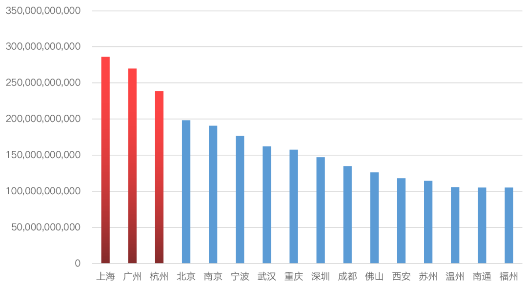CRIC統計數據顯示,截止到2020年12月17日,全國重點50個城市土地出讓金額達到4.31萬億,其中上海土地出讓金居全國首位,達到了2861億元,同比增長39.52%,其次,廣州、杭州分別以2697億元、2385億元位列第二和第三位。此外,北京、南京、寧波、武漢、重慶、深圳、成都、佛山、西安、蘇州、溫州、南通和福州的土地出讓金也突破千億元,至此,全國已有16城土地出讓金超過千億元。
