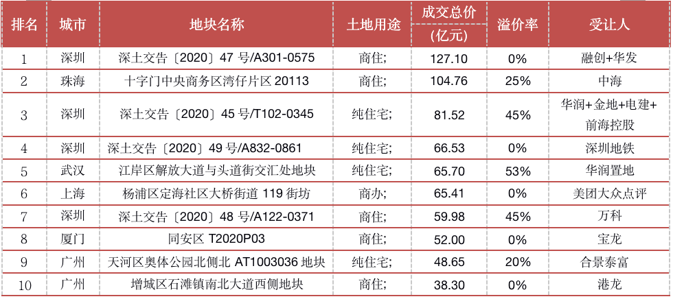 從11月成交總價TOP10地塊來看,一半高總價地塊底價成交,而另一半溢價率則超20%。一般來說,底價成交的地塊出讓要求較為嚴格,或者區位較為一般,因此房企拿地積極性不高。值得注意的是,11月成交總價過百億的城市有2個,其中,珠海十字門中央商務區的一宗大型商住綜合體地塊,由中海以104.76億元的總價競得,該宗地也是珠海土拍史上首宗總價破百億的地塊,成為珠海新的“總價地王”。