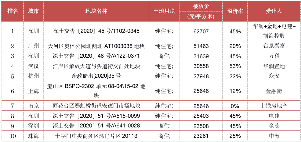 和總價榜大面積低溢價成交的情況不同,11月單價TOP10地塊中僅有1宗地底價成交,其余地塊的成交溢價率多在20%以上,可見優質地塊競爭仍然激烈。成交單價最高的地塊是深圳前海稀缺住宅用地,由金地聯合三家國企競得,成交樓板價為62707元/平方米,比今年5月份龍光拿下的前海宅地成交樓板價低了450元/平方米。