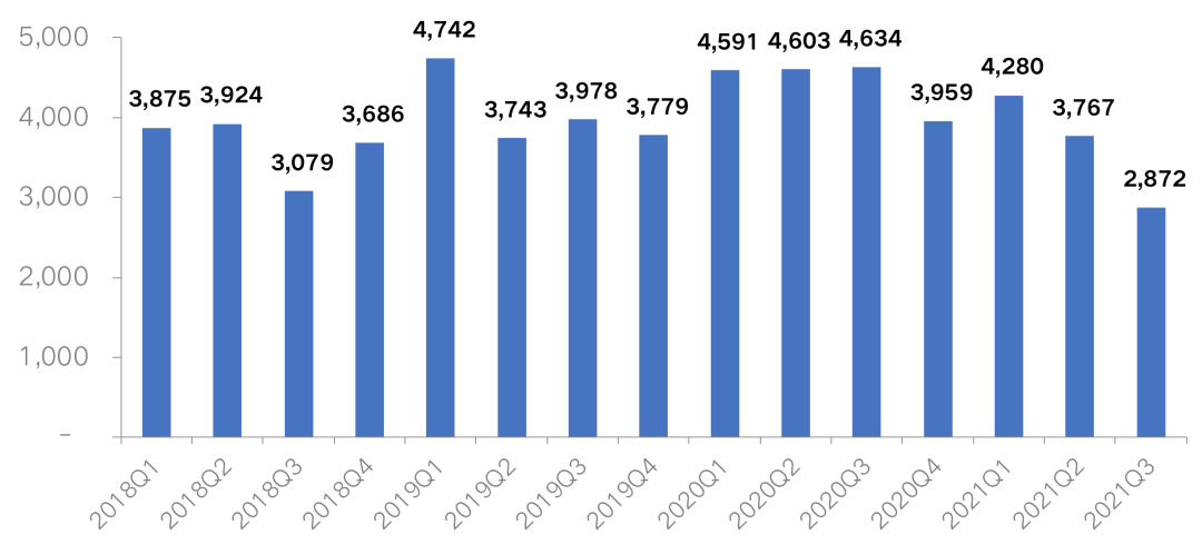 據(jù)不完全統(tǒng)計(jì),2021年前9月100家典型房企的融資量為10919億元,同比下降21%。其中,第三季度的融資額為2872億元,同比下降38%,環(huán)比下降24%,融資額創(chuàng)2018年以來(lái)的最低水平。