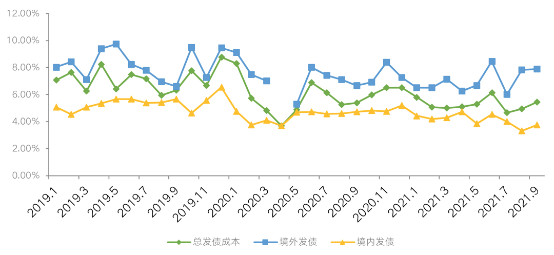 從企業(yè)的債券類融資成本來(lái)看,2021年前9月的新增債券類融資成本5.36%,較2020年全年下降0.71個(gè)百分點(diǎn),其中境外債券融資成本6.92%,較2020年全年下降0.91個(gè)百分點(diǎn),境內(nèi)債券融資成本4.19%,較2020年全年下降0.24個(gè)百分點(diǎn)。
