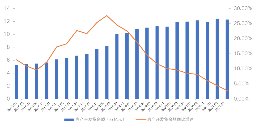 在房地產(chǎn)貸款集中度管理制度的影響下,房企的銀行貸款融資增速持續(xù)走低。銀保監(jiān)會(huì)公布的數(shù)據(jù)顯示,截至7月末,銀行業(yè)房地產(chǎn)貸款余額同比增長(zhǎng)8.7%,增速創(chuàng)8年新低,低于其他各項(xiàng)貸款增速3個(gè)百分點(diǎn);此外,根據(jù)央行公布的數(shù)據(jù),2021年二季度末房地產(chǎn)開(kāi)發(fā)貸余額12.3萬(wàn)億元,同比增速2.8%,增速同樣也是近10年來(lái)的新低。