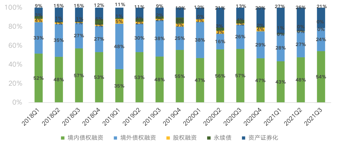 從融資結(jié)構(gòu)來(lái)看,2021年前9月,境內(nèi)債權(quán)融資占比為50%,同比下降了3個(gè)百分點(diǎn),境外債權(quán)融資占比為28%,同比微增1個(gè)百分點(diǎn),資產(chǎn)證券化融資占比則同比增長(zhǎng)了7個(gè)百分點(diǎn)至22%。分季度來(lái)看,第三季度境內(nèi)債權(quán)融資占比最大,同比下降了3個(gè)百分點(diǎn)至54%,環(huán)比上升了6個(gè)百分點(diǎn);而境外債權(quán)融資占比為24%,同比下降了2個(gè)百分點(diǎn),環(huán)比下降了3個(gè)百分點(diǎn),三季度美元債市場(chǎng)波動(dòng)較大,房企沒(méi)有融資窗口期,房企進(jìn)行境外融資較為謹(jǐn)慎。