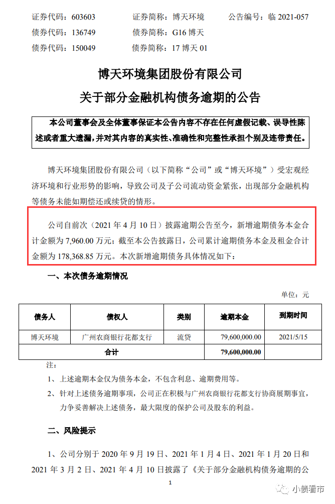 公告顯示,博天環境新增逾期債務本金合計7960萬元,截至公告披露日累計逾期債務本金及租金合計金額為17.84億元。