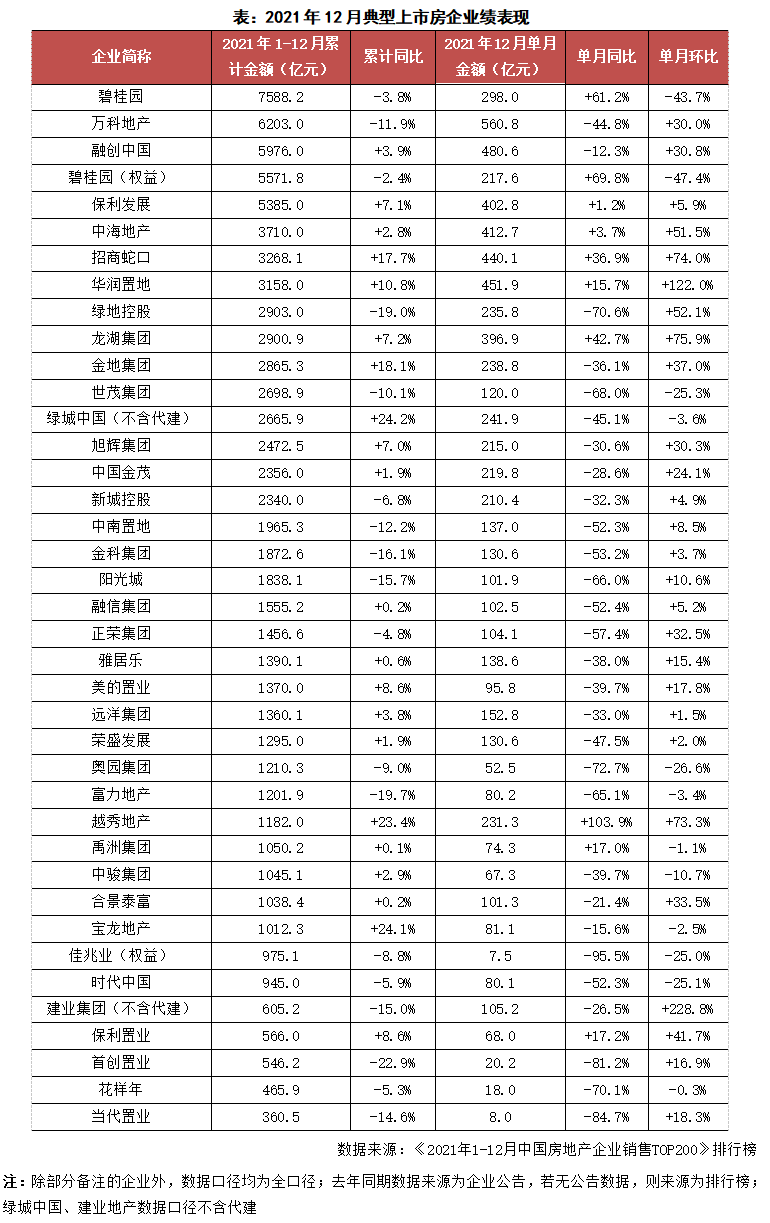 從企業表現來看,38家典型上市房企中,12月超7成房企單月業績同比降低,其中近半數房企同比降幅大于40%,9家房企單月業績同環比雙降。僅碧桂園、招商、華潤、龍湖、越秀等實現了較高的單月業績同比增長。截至12月末,38家典型上市房企中有18家企業累計業績同比負增長,銷售規模負增長的企業數量較2020年有明顯提升。