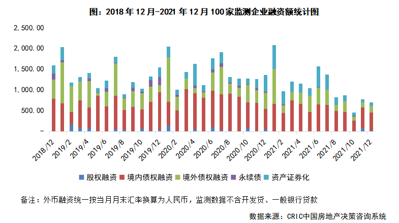 融資總量:2021年12月100家典型房企的融資總量為702.21億元,環比下降10%,同比下降48%。房企融資“冰凍”解封雖得以推進,但當前機構融資仍是偏向財務狀況較好的房企,12月融資量仍屬于年內低位。從融資結構來看,境內債權融資434.05億元,環比下降13.5%,同比下降11.1%;境外債權融資166.52億元,環比上升35.0%,同比下降58.1%;本月資產證券化融資82.57億元,環比上升4.9%,同比下降79.6%。而全年來看,全年融資量13038億元,同比下降26%,近五年來融資量首次出現負增長,同時達到五年來最低點。其中,2021下半年以來,受房企商票違約、債券違約等多方面的影響,房企的融資量8月以后均不足千億元。