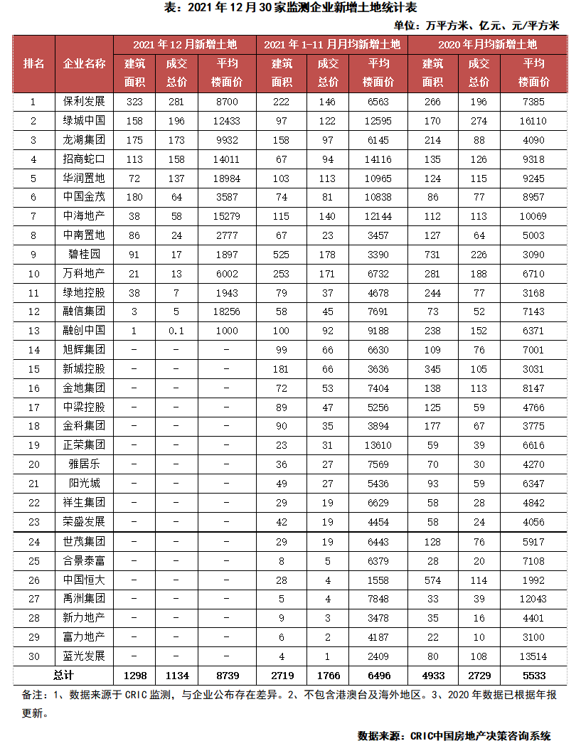 雖然年末融資、供地等政策面釋放了一定的利好信號,但從當前企業的銷售以及融資情況來看,依舊面臨較大的困難。所以短期市場觸底反彈的基礎并不牢靠,預計投資力度的修復仍需要經過3-6個月的調整期。在三穩的預期下,未來各城地價仍有下調空間,如果2022年第一輪集中供地仍然熱度低迷,不排除第二輪集中供地將持續降地價的可能性,因此建議房企關注第二輪集中供地的機會,投資時嚴格把控風險,同時也關注大量城投公司拿地后的合作開發訴求。