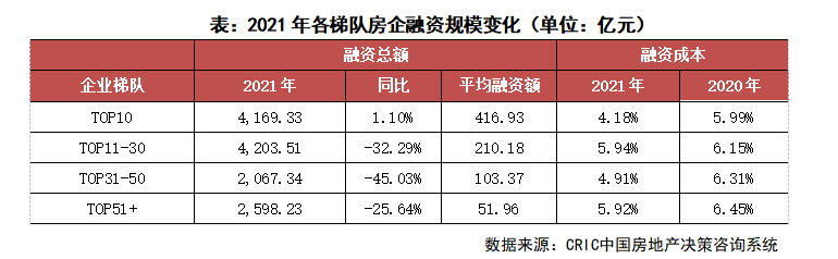 企業表現:本月融資總量最高的企業為華潤置地,融資總量約83.61億元,主要是發行了25億元的公司債,此外進行了多筆境外銀行貸款,還發行了資產證券化產品。從企業梯隊來看,2021年月平均額最大為TOP10房企,平均融資額416.93億元,融資總額同比上升1.10%,唯一一個同比上漲的梯隊;TOP31-50梯隊融資總額同比降幅最大,降幅達到45.03%。成本來看,4個梯隊均同比下降,其中TOP10梯隊降幅最大達到1.81pct,其融資成本也最低,為4.18%。