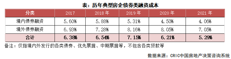 融資成本:2021年100家典型房企新增債券類1融資成本5.29%,同比下降0.93pct,其中境外債券融資成本達7.05%,下降1.01 pct,境內債券融資成本4.06%,下降0.43 pct。單月來看,12月房企融資成本4.52%,環比上升0.72pct,同比下降2.40pct。其中境外融資成本7.02%,環比下降6.48pct;境內融資成本3.73%,環比上升0.31 pct,同比下降1.47pct。境內發債的企業中,融資利率在2.98%-6.80%間,政策的密集發聲下房企發債有所松綁,更多的企業可以進行發債,是以成本區間有所擴大。
