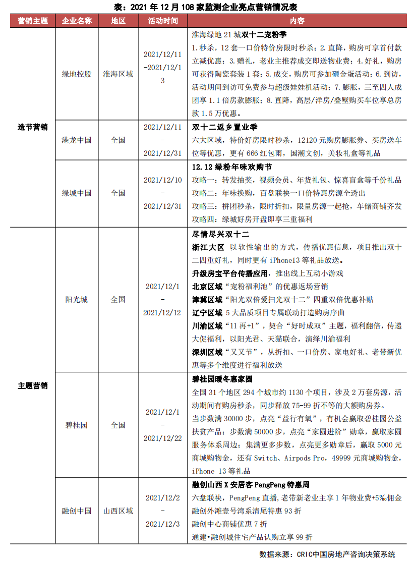臨近年末,房企把握雙十二和年終節點,以造節和主題活動為主要載體推出營銷活動。從市場來看,12月市場略有回升,29個重點監測城市商品住宅成交面積環比增長16%,同比下降35%。其中,一線城市穩步修復,成交環比增長6%,同比仍下降30%。25個二、三線城市企穩回升,環比增長19%、同比仍跌36%。從營銷來看,本月房企營銷仍然積極,臨近年末,碧桂園、綠地、綠城、融創等一眾房企紛紛推出了雙十二和年終營銷活動,形式上仍然以造節和主題活動為主。
