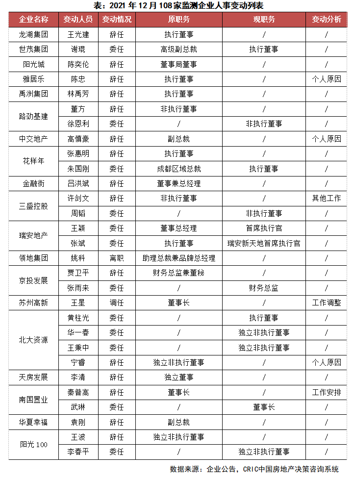 12月,房企高層人事動態信息數量較前一月基本持平,從108家監測企業的人事變動情況來看,房企對組織架構的調整仍在繼續,管理層的重整仍在深化,加之年終節點,高層大范圍變動時有發生。