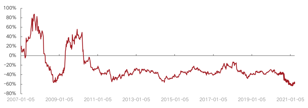 從估值來看,地產股持續受政策及大市影響,2021年3月克而瑞內房股領先指數估值平穩,指數相對恒指PE繼續回升。