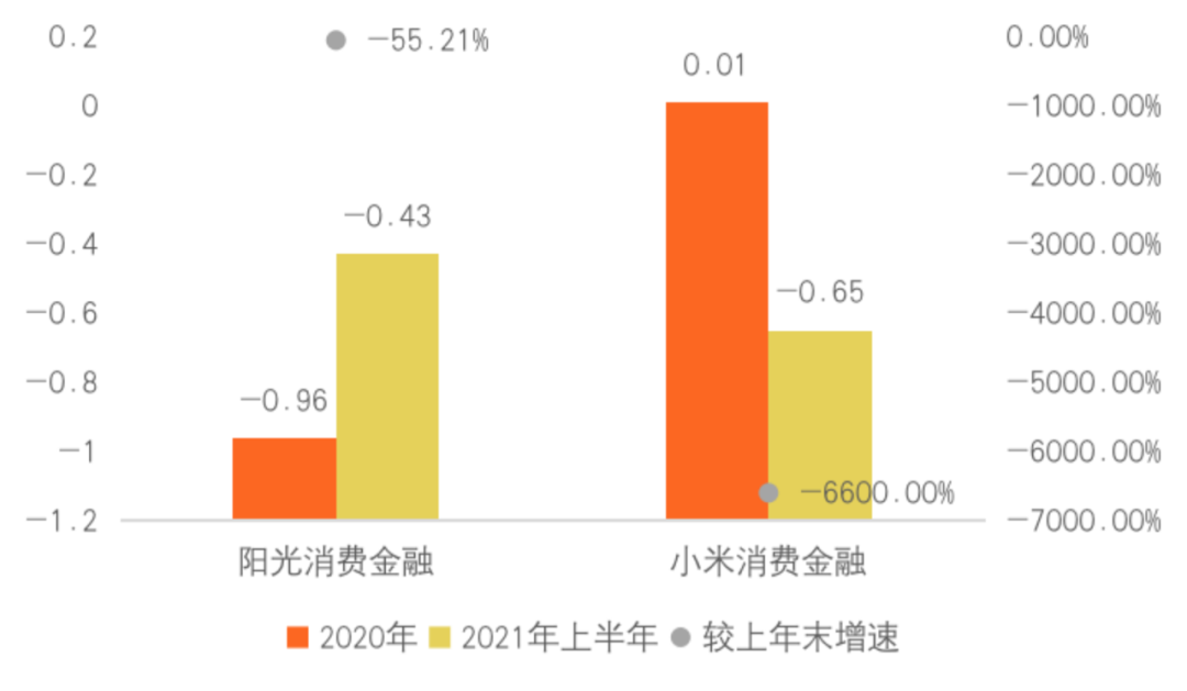 在凈利潤方面,陽光消費金融與小米消費金融均呈現虧損。小米消費金融在2020年實現了0.01億元的盈利后,2021年上半年由盈轉虧,虧損了0.65億元。相比之下,陽光消費金融繼2020年虧損9554萬元后,在2021年上半年繼續虧損4252萬元。在成立的一年時間內,陽光消費金融的總虧損近1.4億元。對此,陽光消費金融表示,因業務規模發展速度較快,受計提撥備影響,故上半年凈利潤呈現小幅虧損。