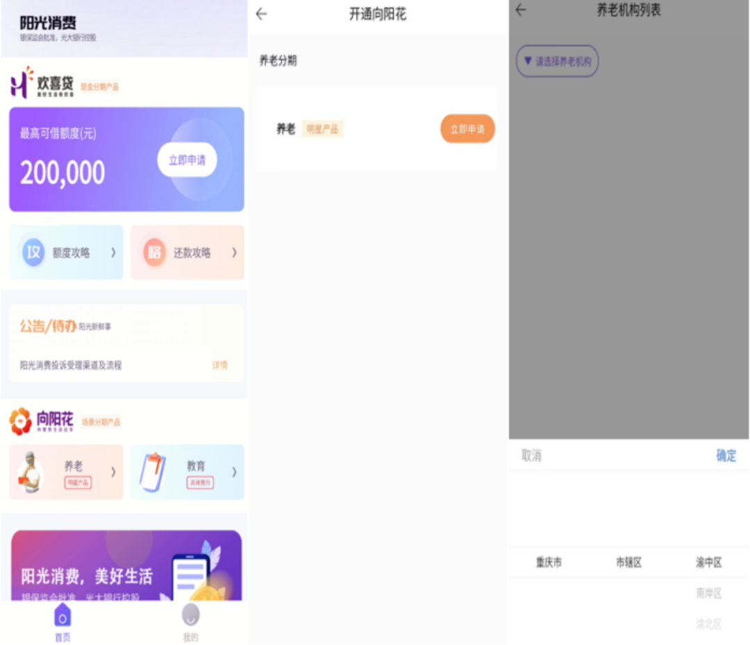 同樣,在該產品的利率披露上,陽光消費金融也未能按要求公示利率。此外,在養老機構方面,陽光消費金融APP頁面顯示,用戶可通過“養老(明星產品)”進行申請,選擇養老機構,但目前僅向重慶市的渝中區、南岸區、渝北區的共六家養老機構開放。此前2021年5月,陽光消費金融APP界面顯示,其覆蓋地區還包括北京、上海、天津、河北、山西等多個地區,對此,陽光消費金融客服人員表示后續會陸續對其他省份開放該產品,并增加其他針對日常消費的場景分期產品。
