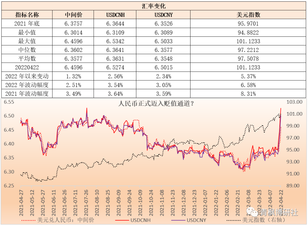 經(jīng)過2021年11月以來長(zhǎng)達(dá)四個(gè)多月的平靜期后,人民幣自2022年3月以來開始進(jìn)入趨勢(shì)性貶值的格局,貶值壓力終于得到一定程度的釋放,僅本周一周貶值幅度便走過2%,離岸人民幣期間一度貶值6.5346。