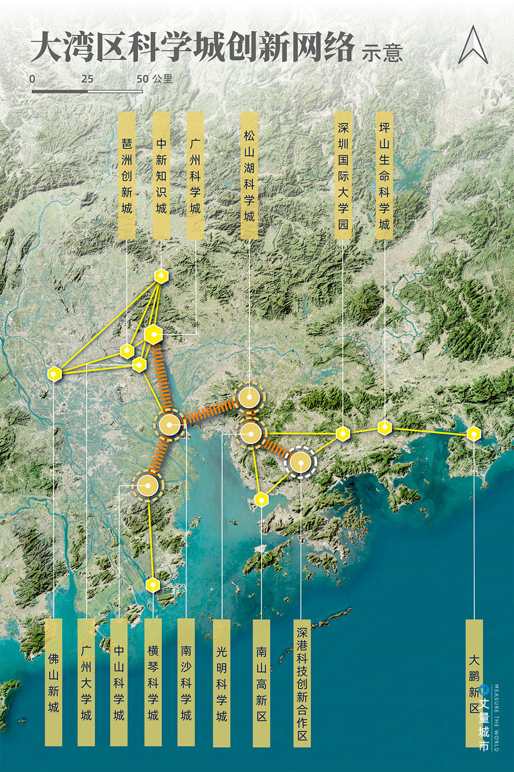 ▼ 大灣區(qū)的科學城與周邊的創(chuàng)新節(jié)點構成創(chuàng)新網絡