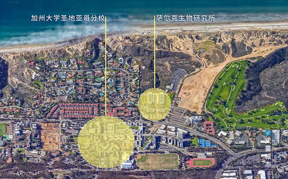 ▼ 薩爾克生物研究所和加州大學圣地亞哥分校的區(qū)位關系示意