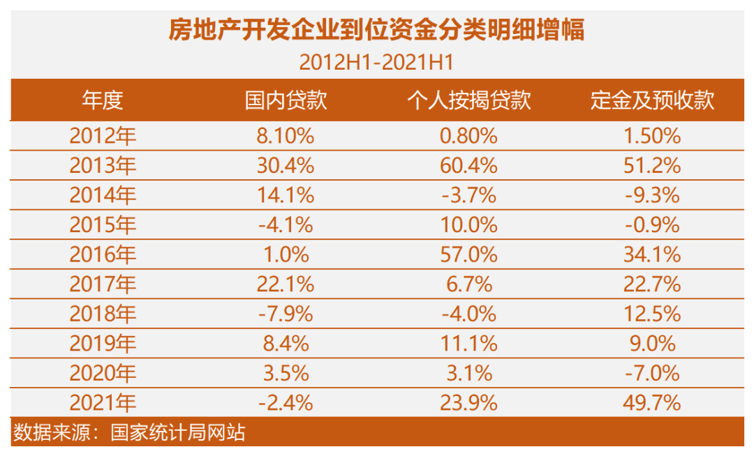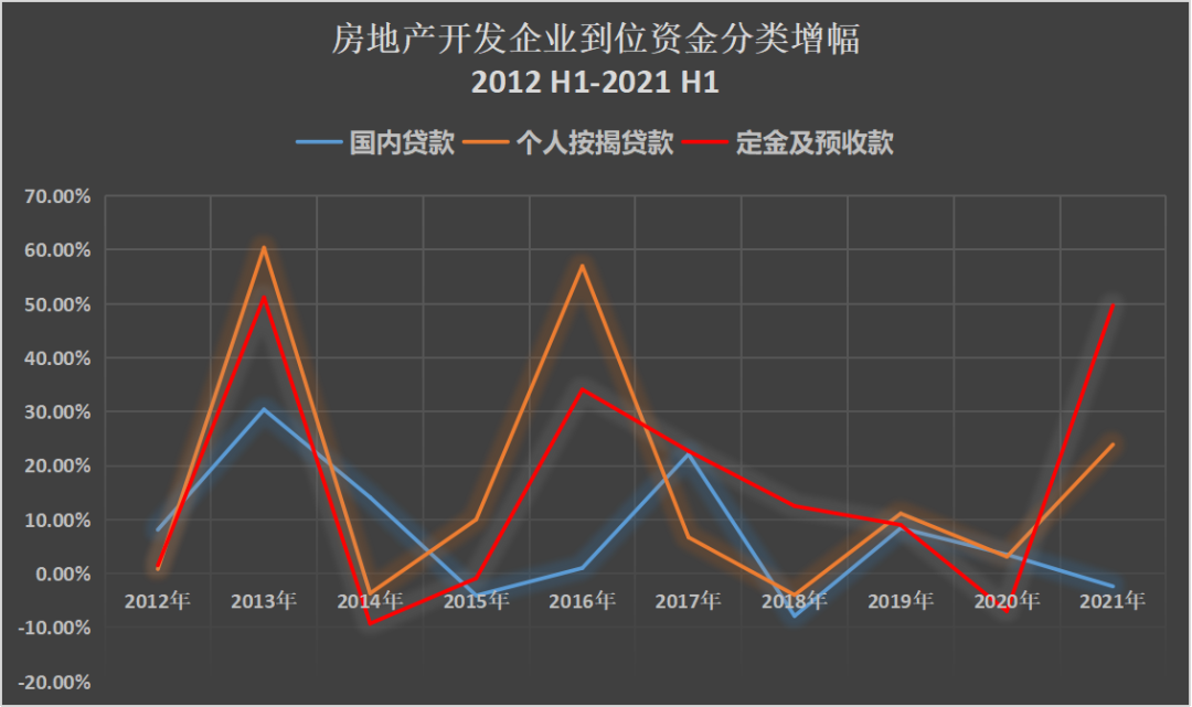 重點看國內貸款、定金及預收款、個人按揭貸款三項的增幅,2012年上半年到2021年上半年這十年的情況如下:
