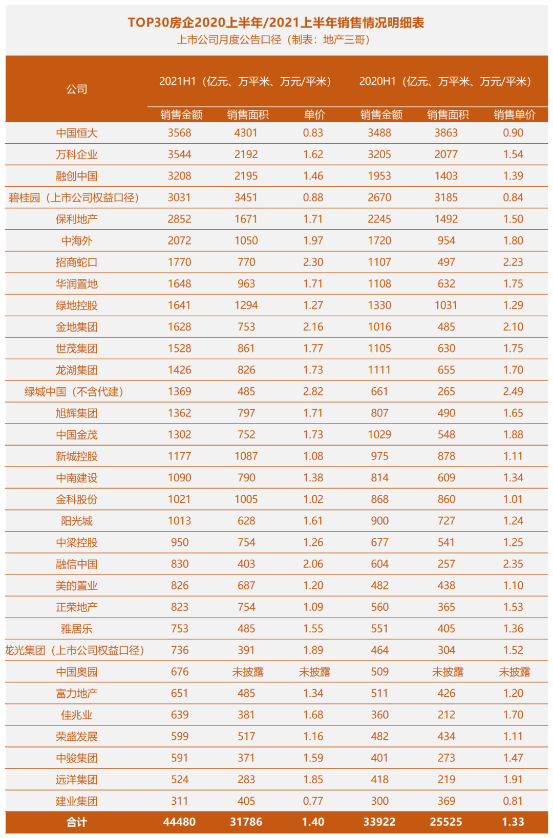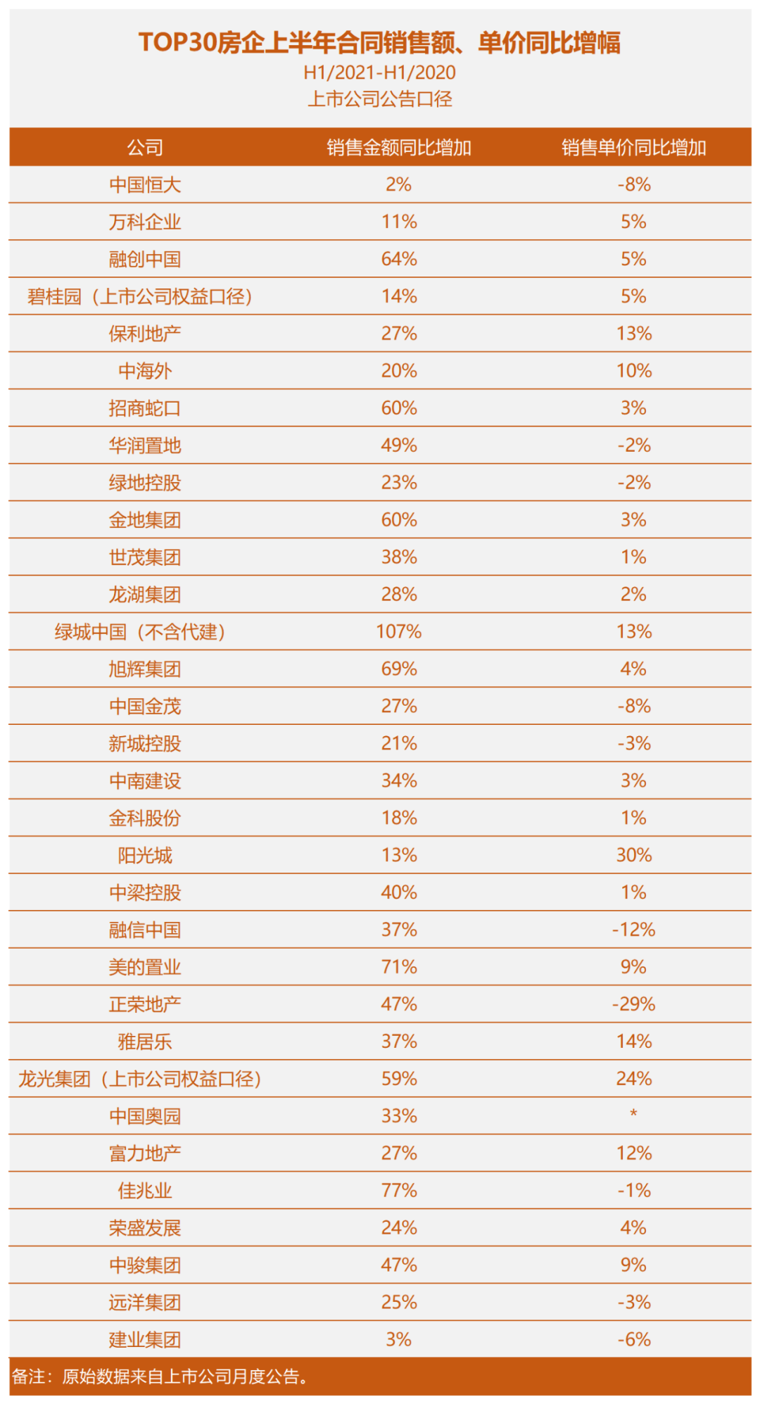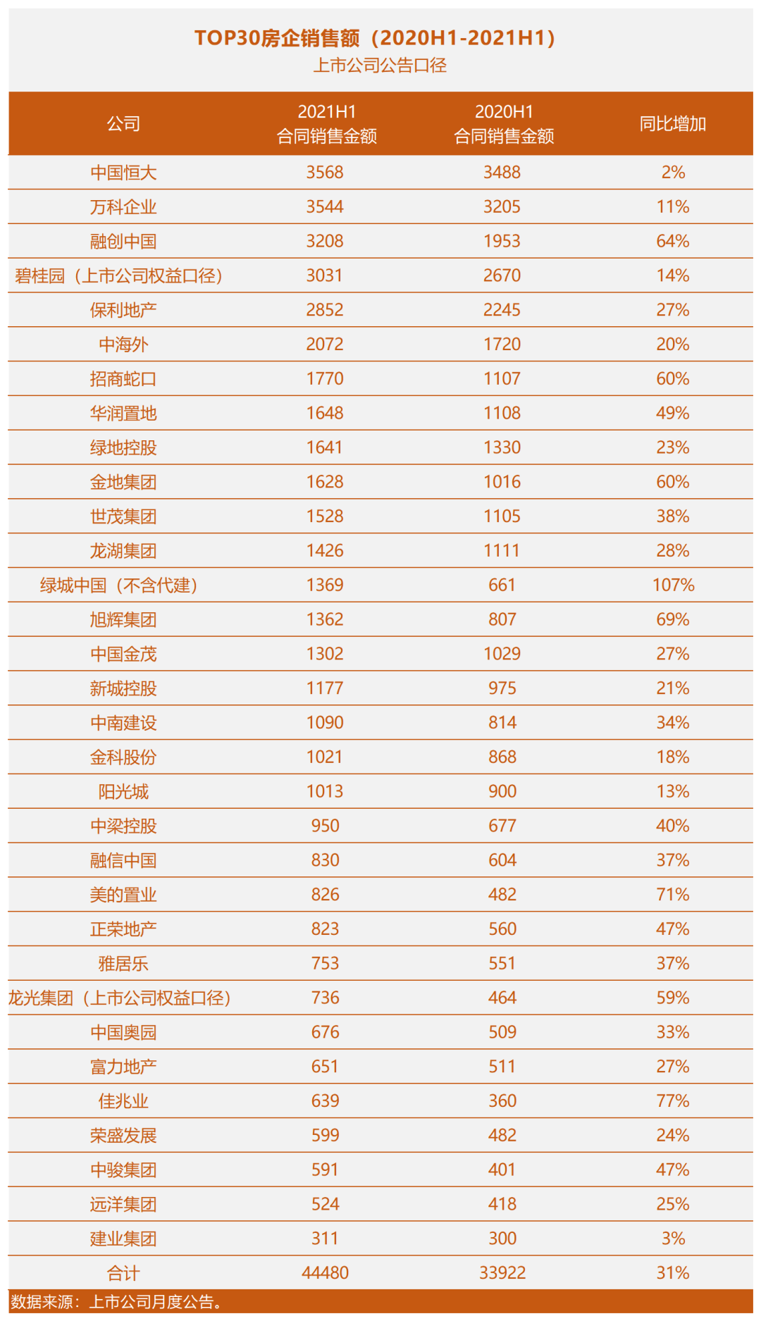 我們用上市房企月度公告口徑,對比了TOP30房企的銷售業績(2020年上半年與2021年上半年):