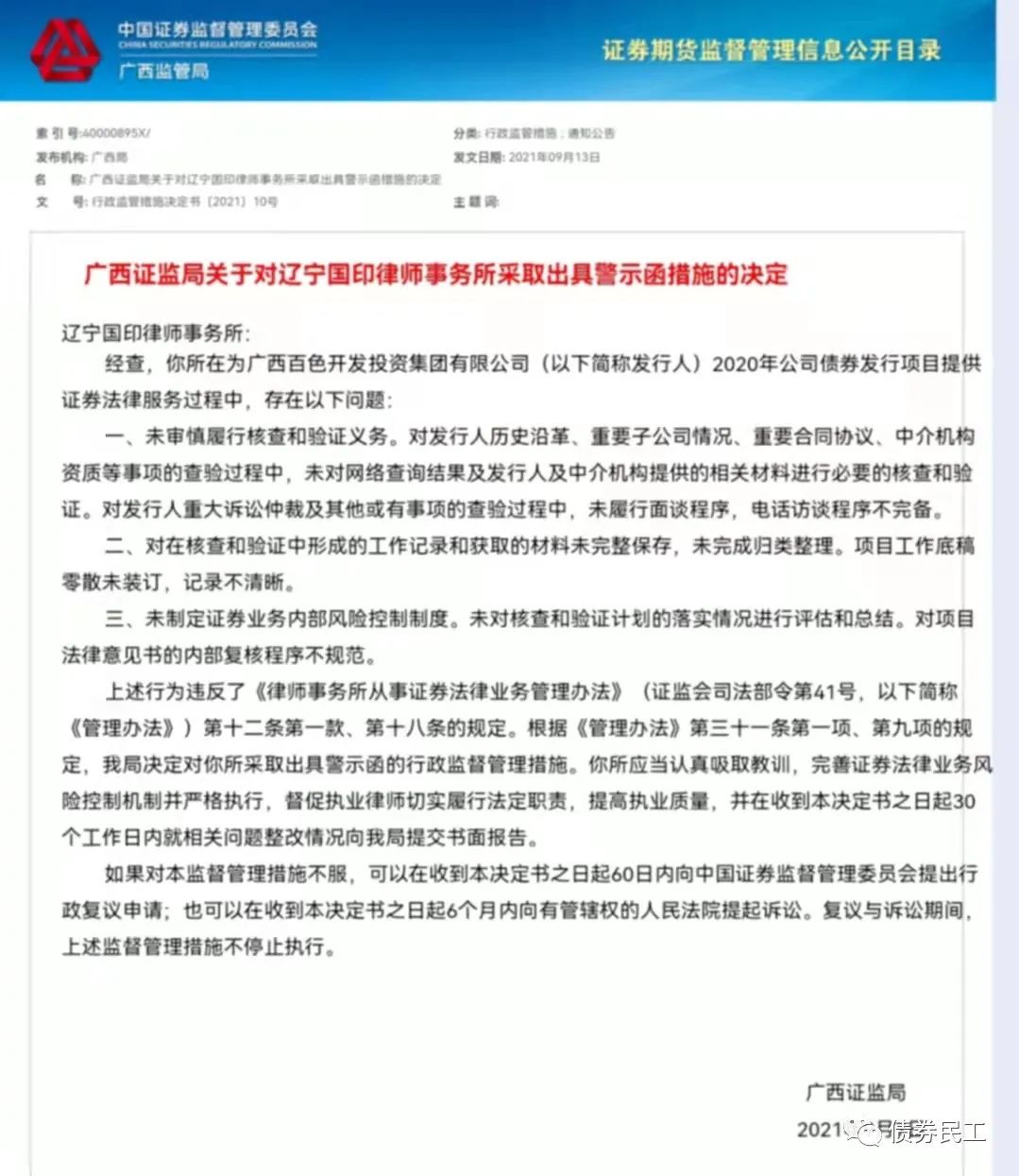 根據(jù)廣西證監(jiān)局2021年9月13日披露的公開信息,遼寧國(guó)印律師事務(wù)所因?yàn)樵趶V西百色開發(fā)投資集團(tuán)有限公司2020年公司債券發(fā)行項(xiàng)目中存在未審慎履行核查和驗(yàn)證義務(wù)、未完整保存和歸類整理盡調(diào)底稿、未制定證券業(yè)務(wù)內(nèi)部風(fēng)險(xiǎn)控制制度等問題,被廣西證監(jiān)局采取出具警示函措施。
