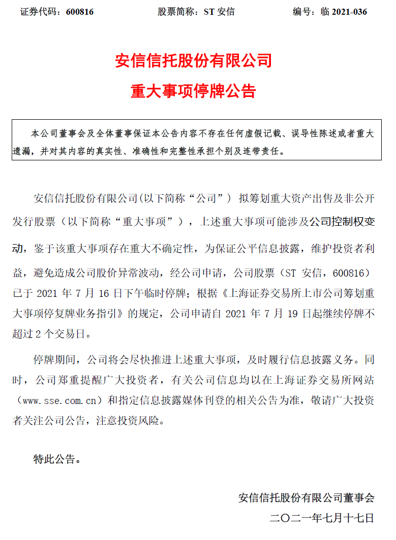 就在今天晚間的時候,ST安信發布公告稱:公司擬籌劃重大資產出售及非公開發行股票,該重大事項可能涉及公司控制權變動,鑒于該重大事項存在重大不確定性,為保證公平信息披露,維護投資者利益,避免造成公司股價異常波動,經公司申請,公司股票已于2021年7月16日下午臨時停牌;公司申請自2021年7月19日起繼續停牌不超過2個交易日。停牌期間,公司將會盡快推進上述重大事項,及時履行信息披露義務。同時,鄭重提醒廣大投資者,有關公司信息均以上海證券交易所和指定的信息披露媒體刊登的相關公告為準,敬請廣大投資者關注公司公告,注意投資風險。看到這里不得不感嘆,安信信托重組總算有了實質性的進展,雖然還有很長很長的路要走。于是馬不停蹄地打開電腦,寫下這篇文章。二.有跡可循的重組