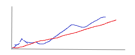 小編舉個簡單的例子,下圖紅線代表攤余成本估值的凈值走勢,藍線代表市值法的凈值走勢,紅線代表的波動率不就是投資者夢寐以求的嗎,也難怪是沖規模“利器”。