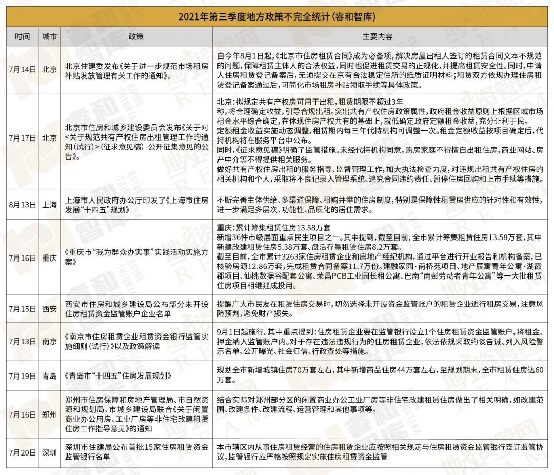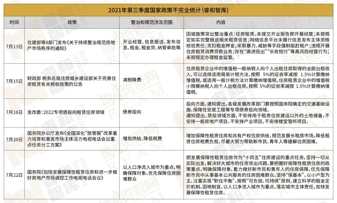 黨的“十九大”報(bào)告明確提出要加快建立多主體供給、多渠道保障、租購(gòu)并舉的住房制度。2021年以來(lái),土地、稅費(fèi)等多維度利好政策頻頻推出。睿和智庫(kù)以2021年第三季度為周期進(jìn)行了部分梳理。