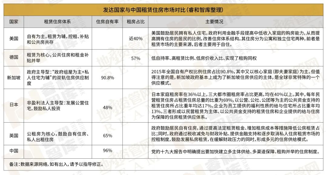 美國(guó)、德國(guó)、日本、新加坡、英國(guó)等發(fā)達(dá)國(guó)家都擁有比較成熟發(fā)達(dá)的住房租賃市場(chǎng)和完善的住房租賃政策。租賃是住房供應(yīng)的“雙引擎”之一,一般占據(jù)40%~60%的市場(chǎng)份額。其中,新加坡供應(yīng)模式非常特殊,政府基本上成為了住房供應(yīng)的主體。