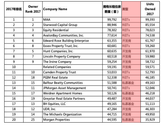 從模式看,數(shù)據(jù)顯示,美國(guó)2017年擁有長(zhǎng)租住房數(shù)量排名前20的住房租賃企業(yè)具有以下特點(diǎn):住房租賃企業(yè)以REITs和開(kāi)發(fā)商為主, 前20的企業(yè)均為重資產(chǎn)運(yùn)營(yíng)商。