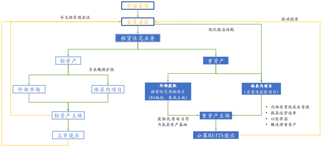如何輕重結(jié)合?以金茂為例,公寓業(yè)態(tài)優(yōu)先尋求規(guī)模擴(kuò)張,夯實(shí)底層重資產(chǎn)基礎(chǔ),并在形成現(xiàn)金流的基礎(chǔ)上,提升體系內(nèi)滯重資產(chǎn)的運(yùn)營(yíng)效率,并將滿足條件的體系內(nèi)自持部分裝入重資產(chǎn)主體,構(gòu)建公募REITs底層資產(chǎn), 打通投融管退全生命周期。